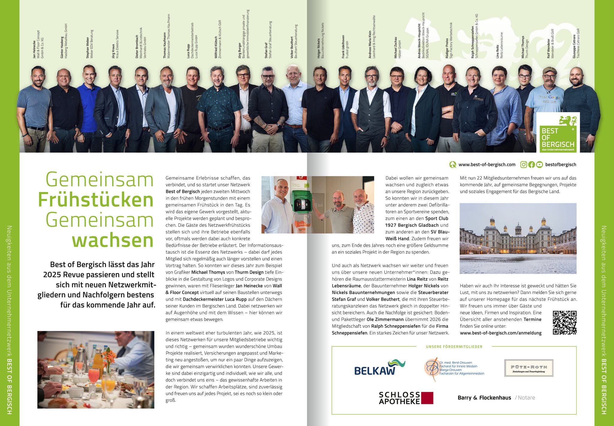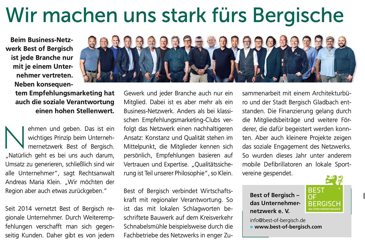 Es liegt auf der Hand, dass ein Netzwerk wie Best of Bergisch umso erfolgreicher ist, je mehr Branchen vertreten sind. Jedes einzelne unserer Mitglieder ist für alle anderen der werbende Außendienstmitarbeiter. Wenn die Angebotspalette breit ist, ist der ansprechbare Kundenkreis größer. Diese Erkenntnis mag dem einen oder anderen vielleicht banal erscheinen, sie ist aber eine wesentliche Säule unseres Erfolges.